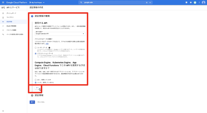 「Compute Engine、Kubernetes Engine、App Engine、Cloud FucntionsでこのAPIを使用する予定はありますか?」の部分で「いいえ、使用していません」を選択してください。