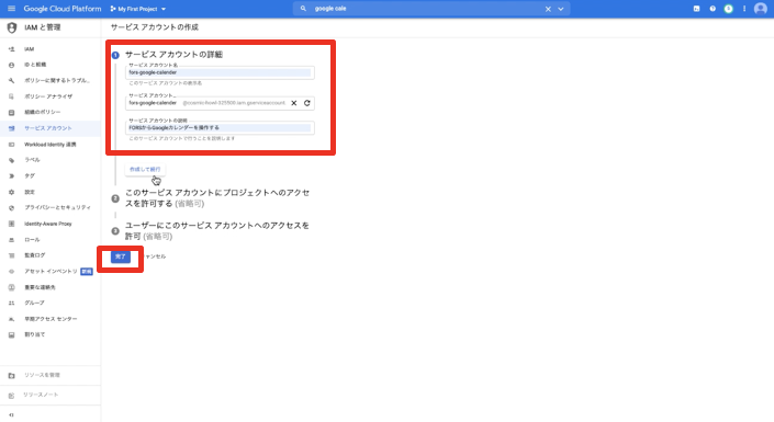 「サービス アカウントの説明」部分で「FORSからGoogleカレンダーを操作する」と説明を入力してください。
