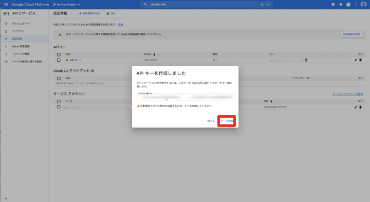 ポップアップが表示されて「APIキーを作成しました」と表示されます。