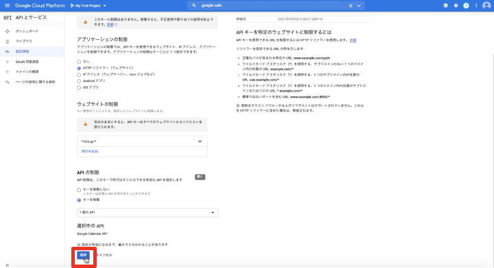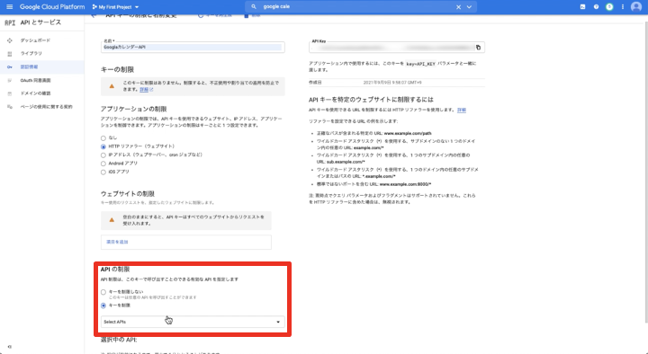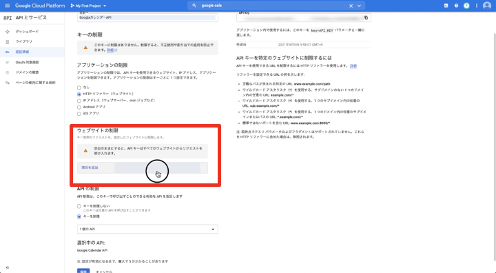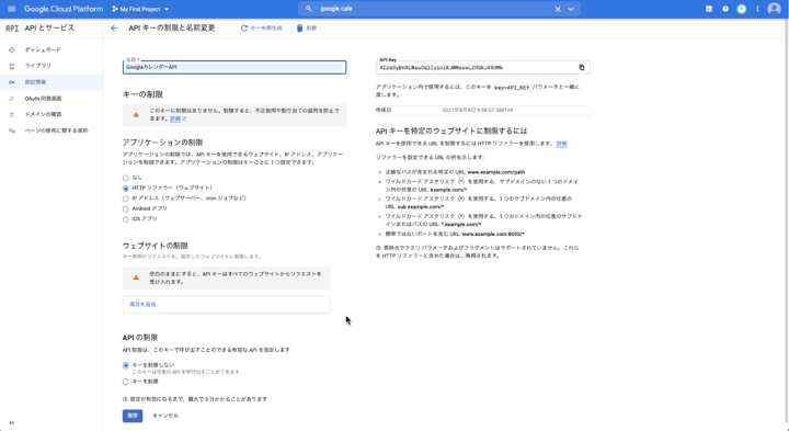 「名前」部分に「GoogleカレンダーAPI」と入力してください。「アプリケーションの制限」部分で「HTTPリファラー (ウェブサイト)」を選択してください。