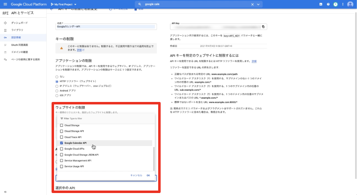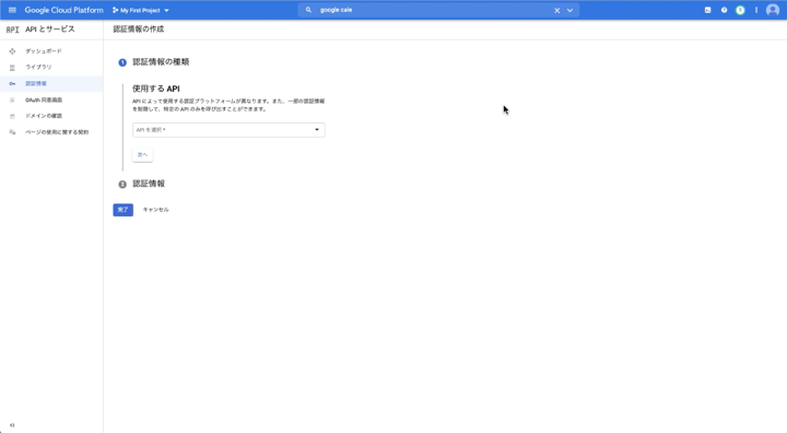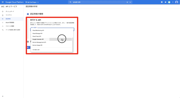 「APIを選択」部分で「Google Calender API」を選択してください。