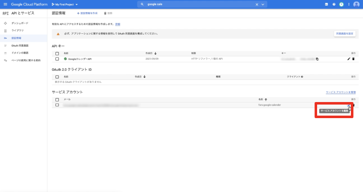 「認証画面」の「サービスアカウント」から先程登録した「fors-google-calender」の「サービスアカウントを編集」を押して下さい。