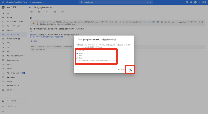 「キーのタイプ」の部分は「JSON」を選択してください。