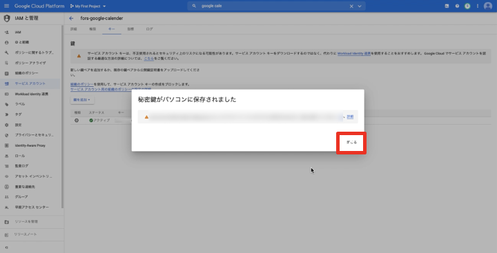 • ダウンロードしたjsonファイルは後ほどGoogleカレンダーとFORSの管理画面で使用します。