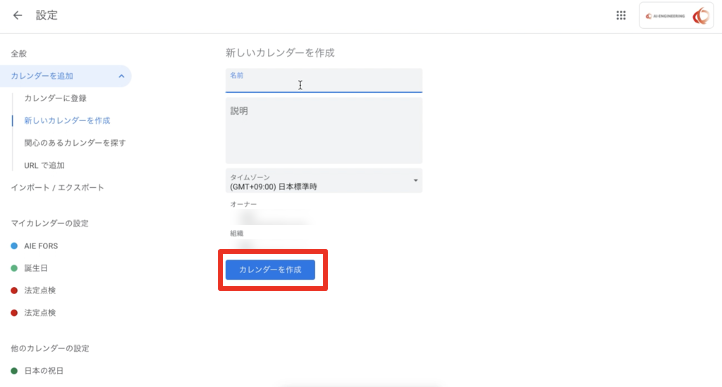 「新しいカレンダーを作成」画面に切り替わったら、カレンダーの名前と説明を入力します。