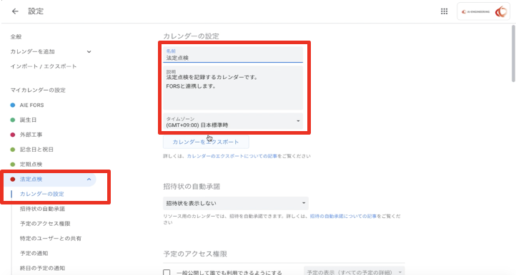 「説明」の部分に「法定工事を記録するカレンダーです。FORSと連携します。」のようにどのような目的のカレンダーかわかる文章を入力してください。
