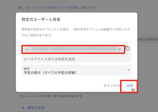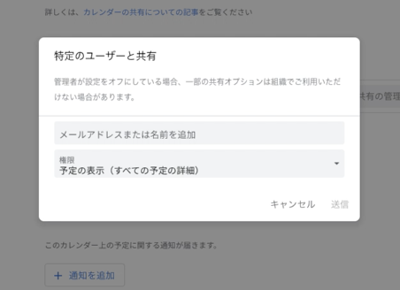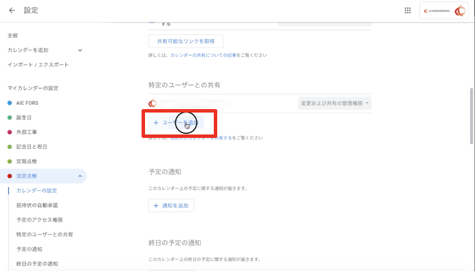 「カレンダーの設定」画面を下にスクロールしていくと、「特定のユーザとの共有」が表示されます。「ユーザーを追加」を押してください。