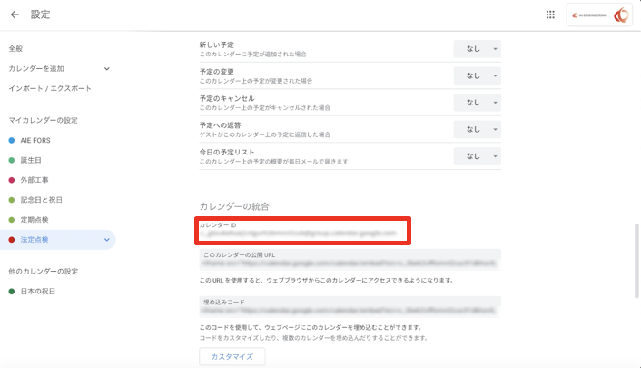 画面を下にスクロールしていくと、「カレンダーID」の入力欄があります。
