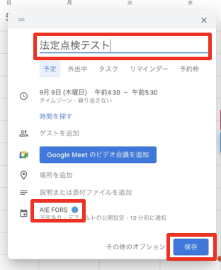 「タイトルを追加」には「法定点検テスト」と入力します。