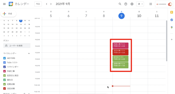 テスト用に作成した予定は、Googleカレンダー上から削除してください。