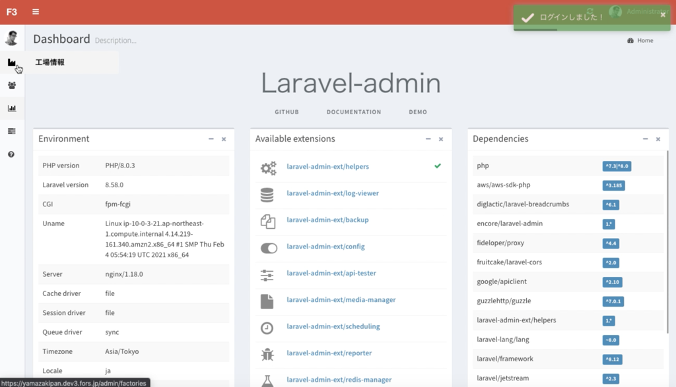 管理者用のユーザー名とパスワードを入力して「ログイン」を押してください。