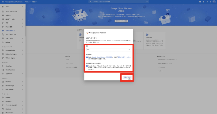 「私は、Google Cloud Platformの利用規約、および適用されるサービスとAPIの利用規約に同意します」にチェックを入れてください。