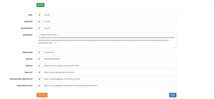 例3)FORS管理画面の「private_key_id」の部分にはjsonファイルに記入されている”private_key_id”部分を確認して、sampleと入力します。