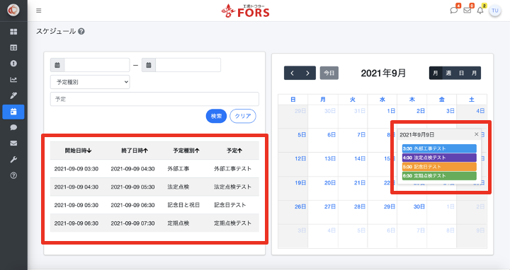 FORSでは「法定点検」「定期点検」「記念日と祝日」「外部工事」、4種類のカレンダーの連携が可能です。